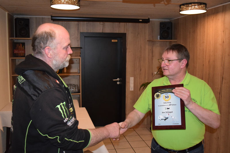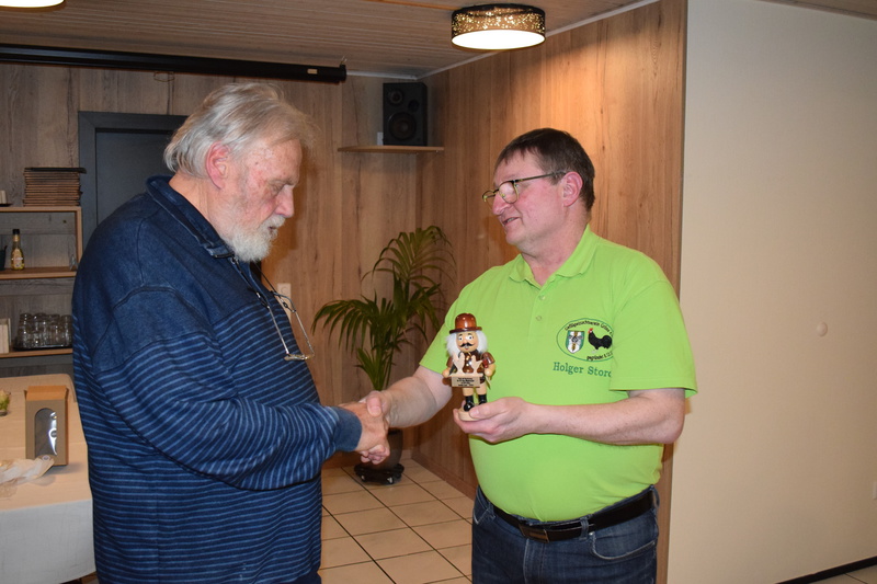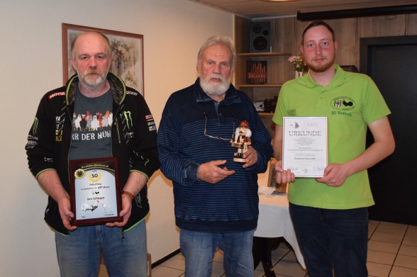 v. l. n. r. Zfrd. Jens Schlegat wurde zum 50. Geburtstag gratuliert. Unser elfmaliger Deutscher Meister, Joachim Lasch, erhielt als Dank und Anerkennung für seine 40-jährige Mitgliedschaft im Verein einen Räuchermann. Unser 2. Vorsitzender Vinzenz Nawroth erhielt die silberne Ehrennadel des SRV. Allen Jubilaren herzlichen Glückwunsch.
